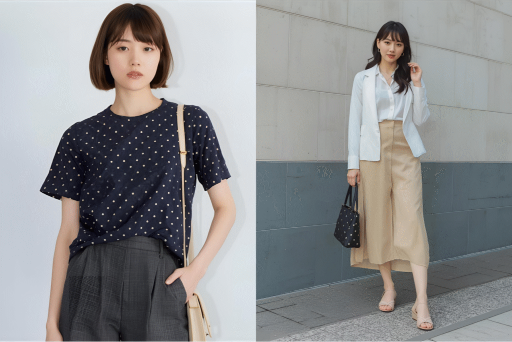 小さめドットブラウス×ネイビーのパンツ×シルバーアクセ