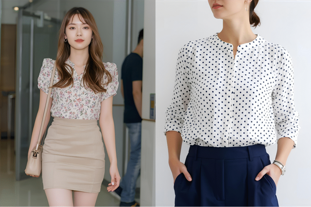 小花柄ブラウス×ベージュのタイトスカート×小さめバッグ