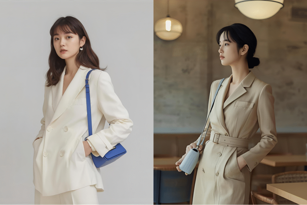 アイボリーコーデにブルーのバッグをプラス